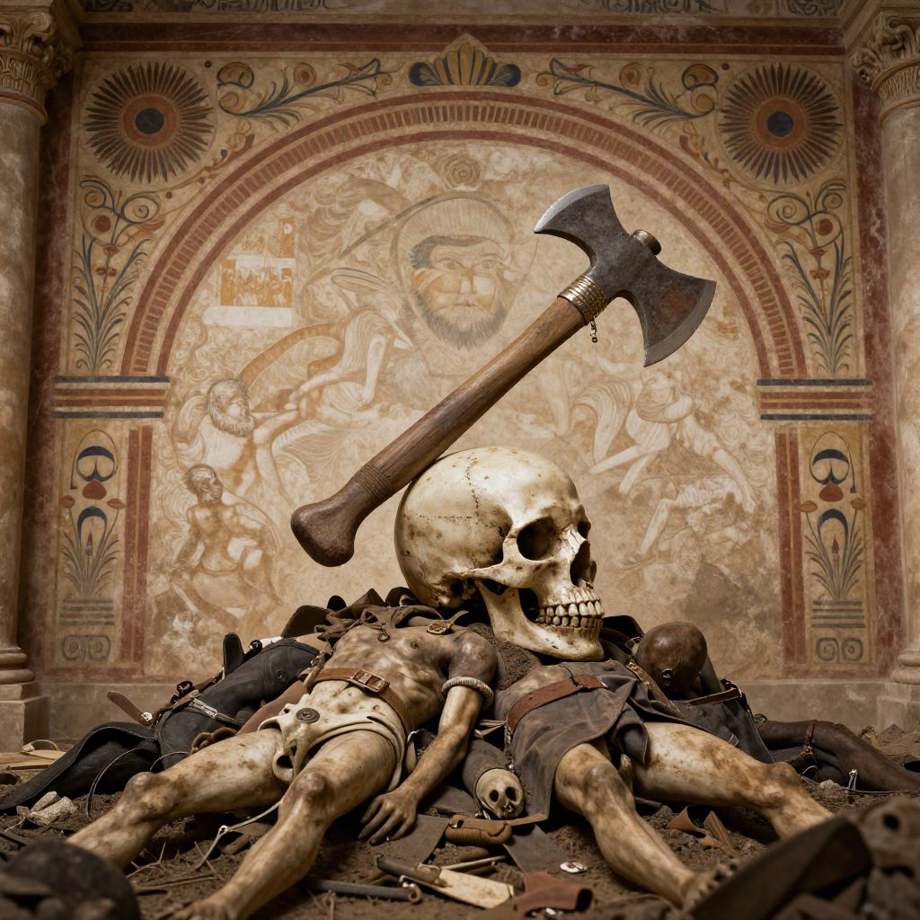Photograph-like digital artwork depicting a gruesome scene: a large, pale human skull with a rusty axe lodged in its forehead rests atop a pile of dark-skinned, lifeless male bodies. The bodies are adorned with leather straps and metal rings. The background features an ancient, ornate fresco with intricate designs and a central, stern-faced deity. The fresco is set within an arched, columned wall. The overall color palette includes earthy browns, blacks, and muted reds, contributing to a dark, historical, and macabre atmosphere. The textures are detailed, emphasizing the decay and desolation of the scene.