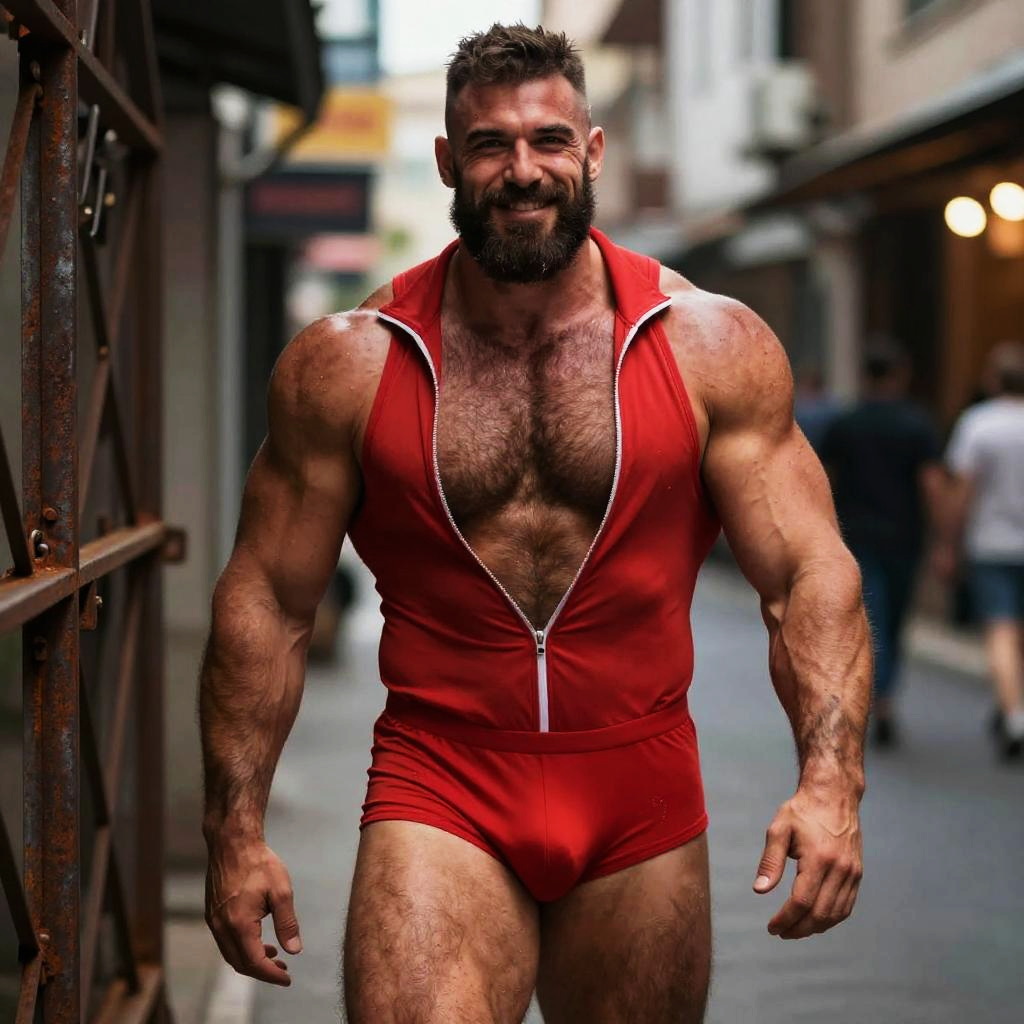 Portrait of a muscular bearded man with hairy chest wearing a revealing red sleeveless tracksuit with a front zipper. He is walking on an urban street with a confident expression and light smile, showcasing his large arms and chest muscles. The setting features soft and cinematic street lighting with a bokeh effect and a slightly hazy film grain overlay.