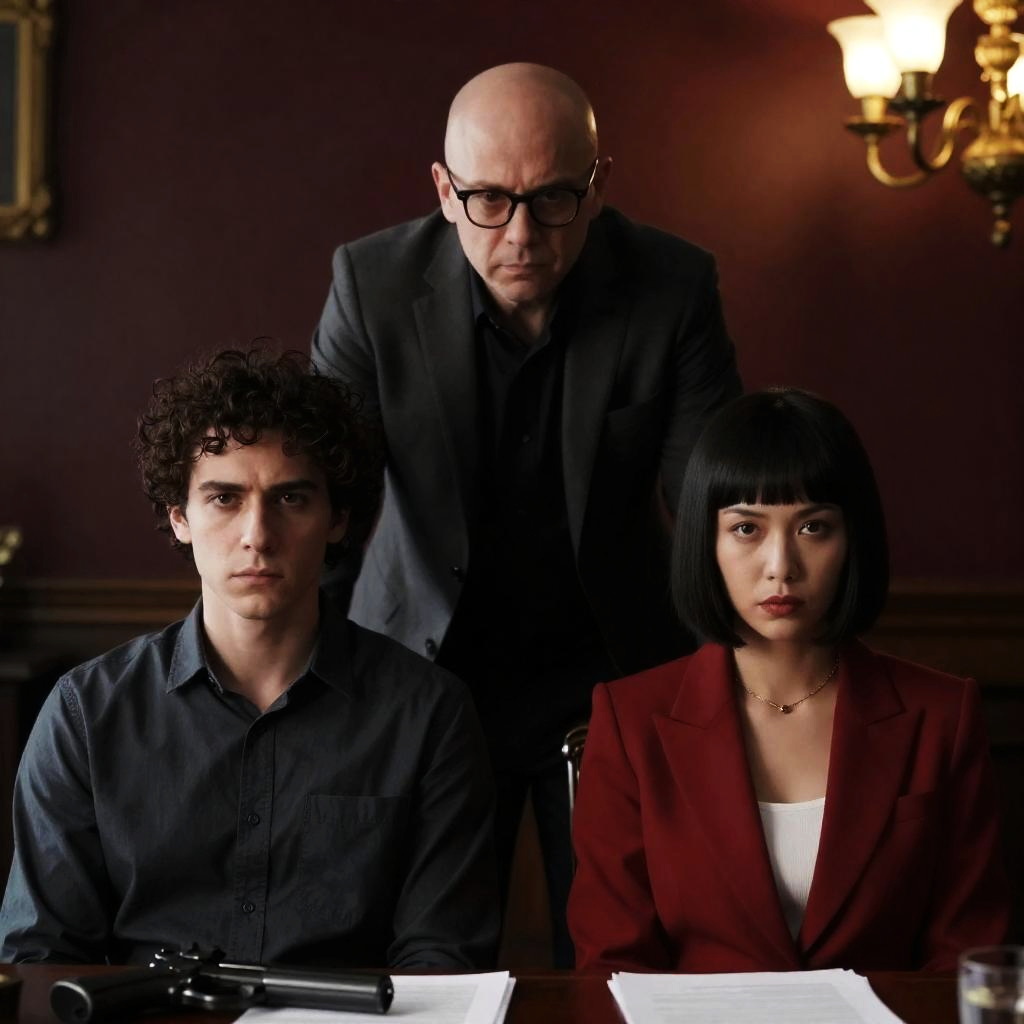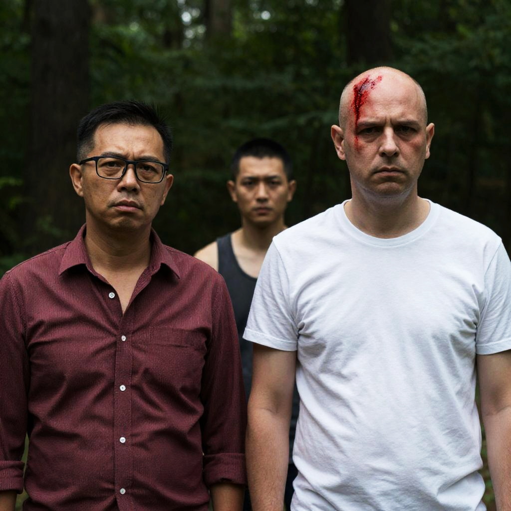 Photograph of five people with intense expressions. A bald man with blood on his face and hand extends his bloody hand forward. Four others, two women and two men, stand behind him. The man in glasses looks concerned, the woman on the left has long brown hair, the woman on the right has short black hair. Background is a plain, light gray.