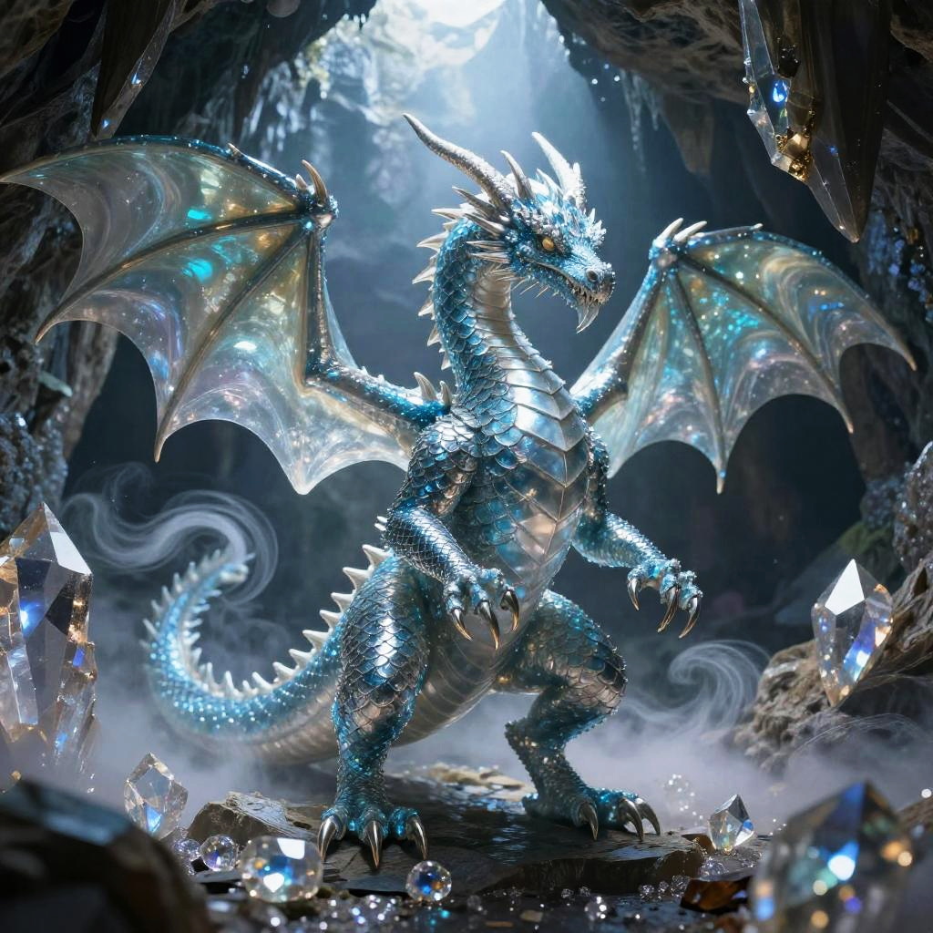 Design your own dragon emerging from a crystal cave, its translucent sapphire and silver scales shimmering under subterranean light, with delicate spiked wings and sharp claws gripping sparkling gems, as ethereal mist curls around, giving an otherworldly mystical vibe.