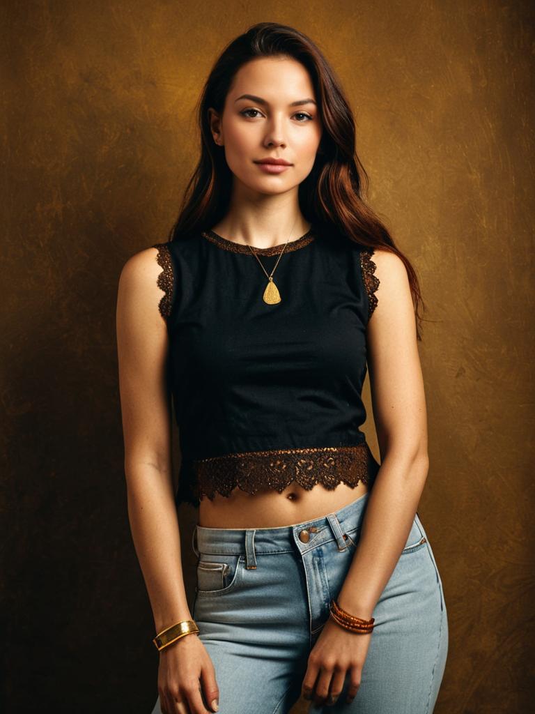 Woman, casual, black sleeveless crop top with lace detailing at the hem, light wash skinny jeans, gold cuff bracelet on one wrist. --sref 1389