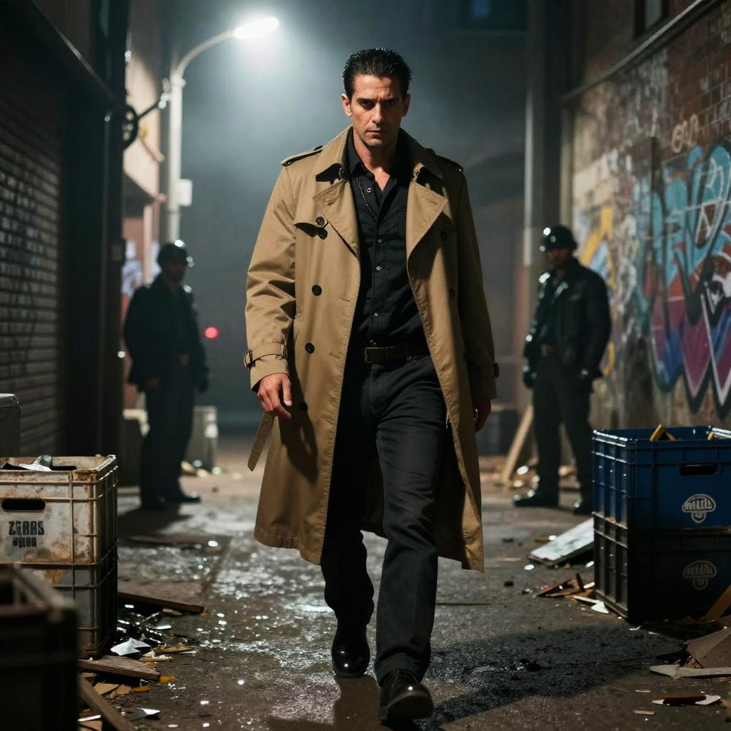 Gangster Edgar walking through an alleyway under a flickering streetlight, trench coat over his shoulders, eyes sharp and alert, with mist rolling in, graffiti walls, broken crates, and a faint silhouette of rival gang members lurking.