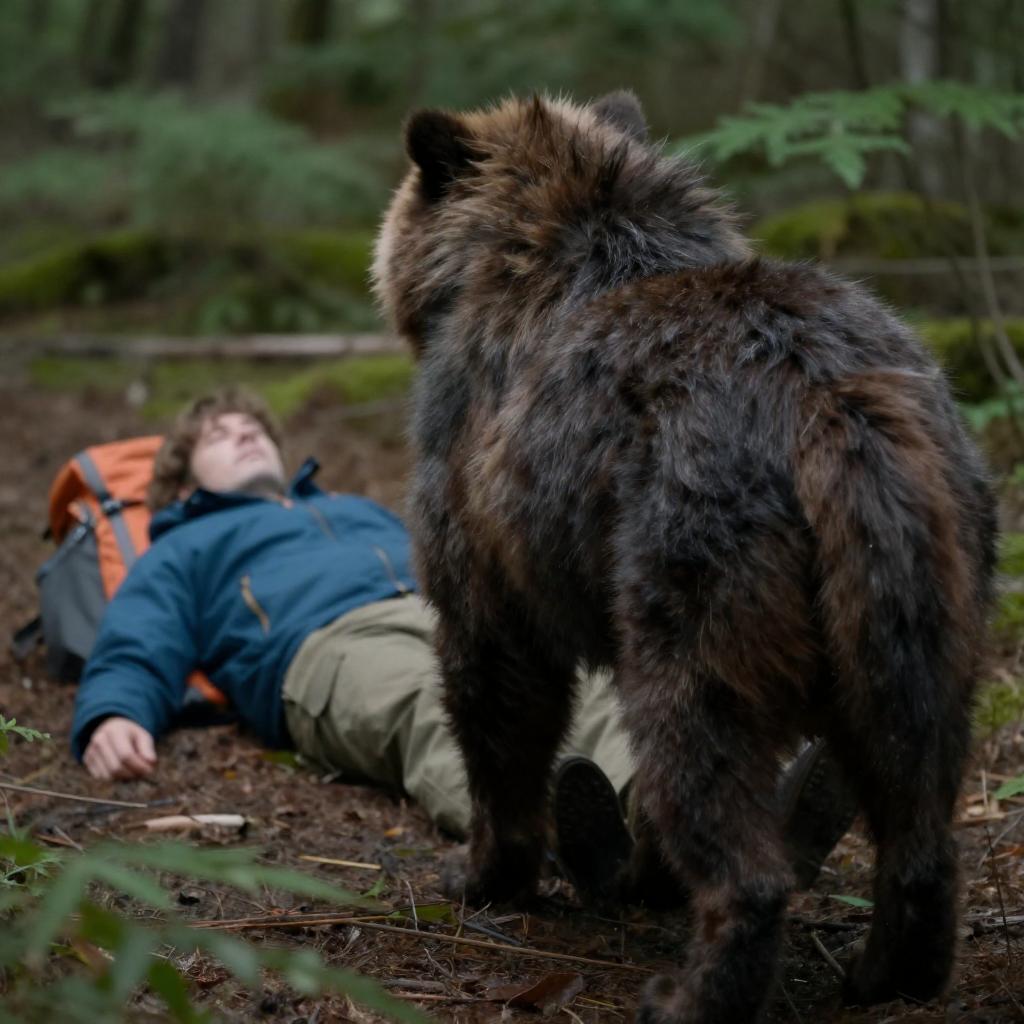 Dark and intense movie still featuring a menacing black werewolf with sharp teeth and claws pinning a man to the ground. The man wears glasses and a dark jacket, looking up in fear. The scene is dimly lit with a shadowy background, emphasizing the dramatic confrontation.