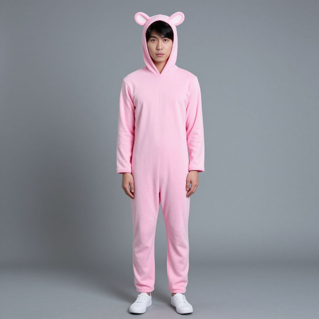 Photograph of an Asian man standing against a plain gray background. He is wearing a full-body, light pink onesie with a hood that has small, white, bear-like ears on top. The onesie is loose-fitting and has long sleeves and pants. He has short, black hair and is wearing white sneakers. His expression is neutral, and he stands with his arms relaxed at his sides. The overall style is playful and slightly whimsical, with the soft pink color and bear ears adding a cute, childlike element to the image.