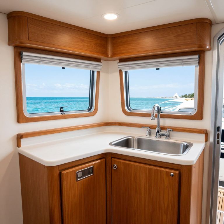 Compact corner sink area in a Sea Ray 400 Sundancer yacht, featuring dual windows with blinds above, wooden cabinetry below, and a countertop with a stainless steel sink and faucet, situated near Clearwater Beach, Florida, United States.