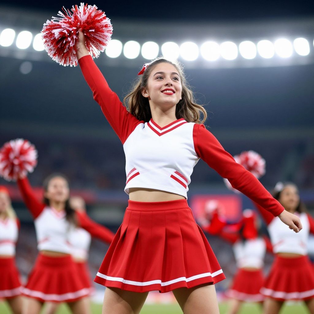 Photograph of a young Caucasian cheerleader with long brown hair, wearing a red and white long-sleeve crop top and red pleated skirt, standing on a brightly lit field. She raises a red and white pom-pom with her right hand, smiling confidently. Her left arm is extended to the side. In the blurred background, other cheerleaders in matching uniforms are visible, also holding pom-poms. The stadium lights create a bright, colorful atmosphere. The image highlights her energetic and vibrant performance.