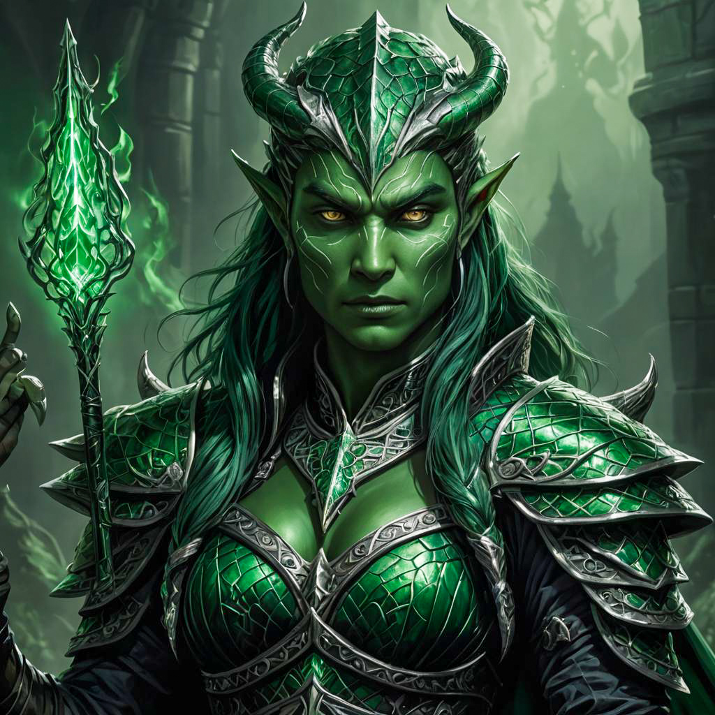 Warlock, dragonborn race, female, DnD 5e, emerald green and silver scales, shadowed staff, detailed scales, mythical fantasy, highres, intense gaze, sinister aura, magical enchanted spear, fantasy, detailed facial features, dramatic lighting, fantasy art, snake-like scales, mystical,