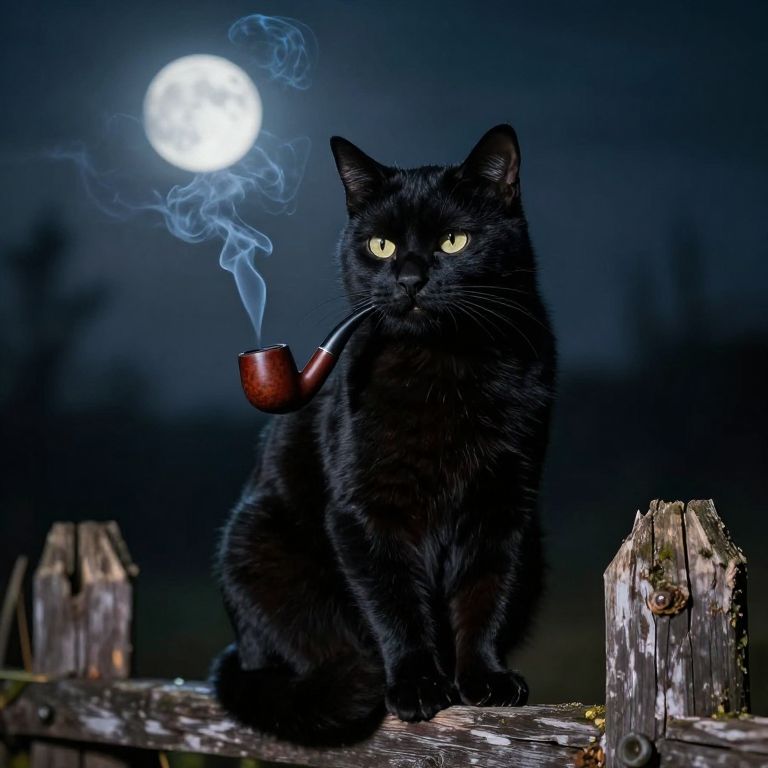 Black cat smoking a vintage pipe, sitting on an old wooden fence under a moonlit night, mysterious fog swirling around, detailed fur texture, cinematic lighting, surreal and moody atmosphere