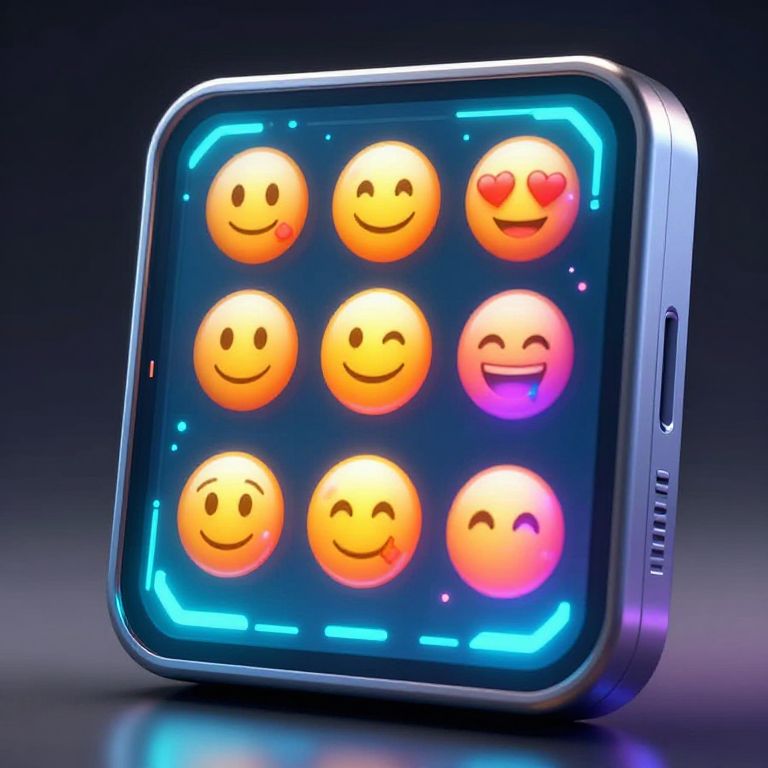 Face emoji generator concept, a futuristic digital device creating diverse expressive face emojis with vibrant colors, holographic interface, glowing buttons, sleek metallic design, dynamic light effects, and cartoonish style, high resolution