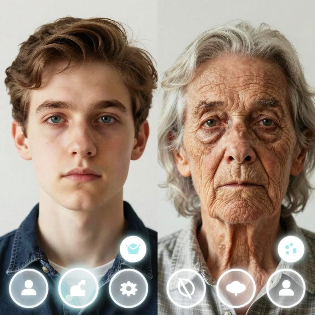 Creative depiction of an old age filter online experience featuring a split-screen: one side young face, other side aged face with deep wrinkles, sagging skin and gray hair, set against a minimalist digital background with glowing interface buttons.