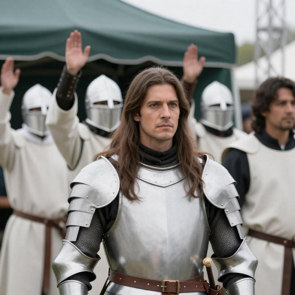 Middle-aged man with brown hair, headband, and armored jacket, smiling, arm raised, chest above muddy ground. Large metal shield behind, debris scattered. Background: dark, rusted, vertical metal surfaces. Foreground: muddy ground, rocks, chains. Action pose, intense expression.