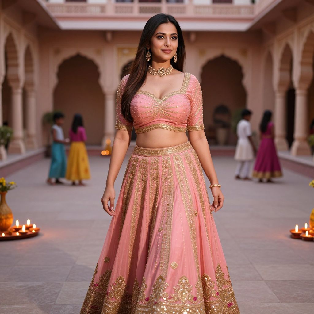 A natural lighting photo of a woman wearing a vibrant lehenga choli designer outfit with a pastel pink base, gold thread detailing, and a fitted choli with a heart-shaped neckline. She has soft peach skin, long straight hair, and a gentle, joyful smile. She is walking through a heritage haveli courtyard during a Diwali celebration, with diyas lit around and children playing in the distance.. The woman has big breasts and cute face