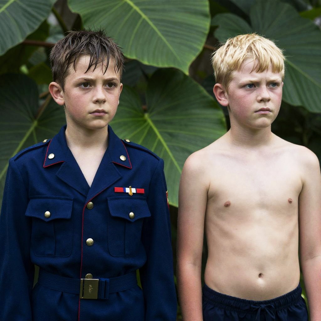 Photograph of two young boys standing in a lush green jungle. Boy on left wears blue military jacket with red trim and medals, wet brown hair, serious expression. Boy on right is shirtless, blonde hair, also serious expression. Large green leaves in background. Both boys have fair skin and lean builds. Military jacket has visible buttons and straps. Both boys look slightly to the right.