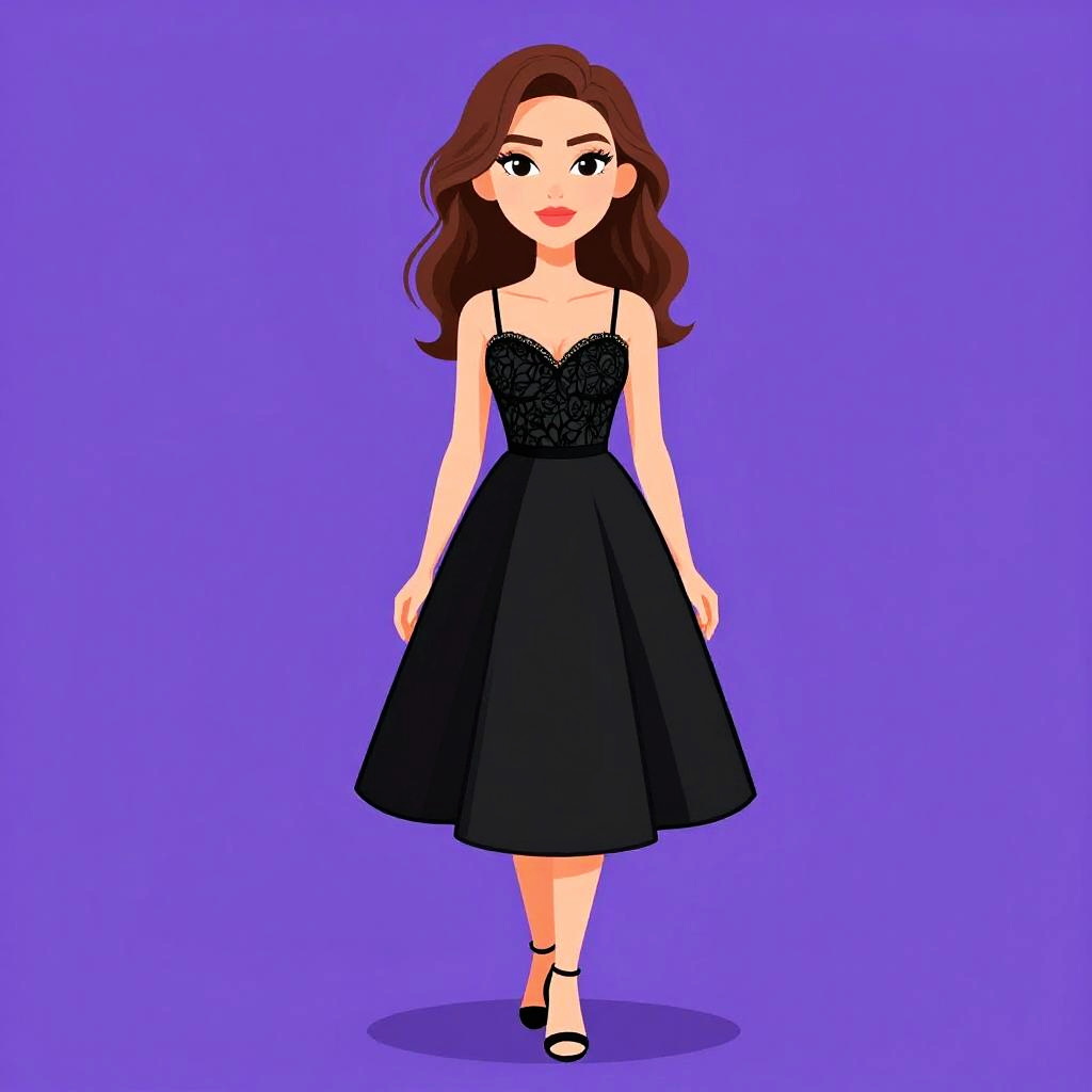 Woman with pretty face and pretty hair. Woman, mod, A-line shift dress with black and brown zigzag pattern, knee-length, short sleeves, black Peter Pan collar, ornamental black flower detail at the neckline, black heeled sandals with ankle strap. --sref 1467