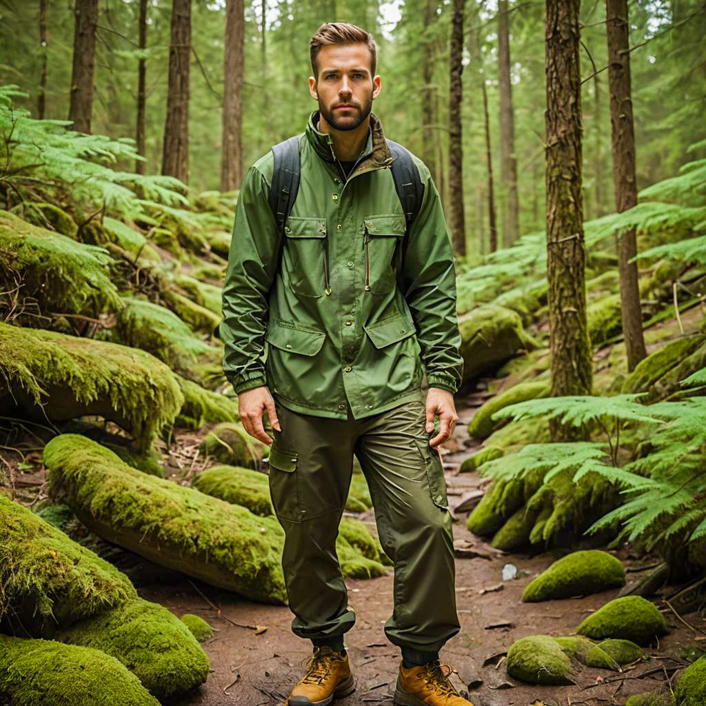 Athletic man with crew cut wearing a green nylon cargo pants, copper brown cotton moisture-wicking shirt, chartreuse fleece jacket, and hiking boots stands on a rocky path in a lush mountain forest with moss-covered rocks and evergreen trees.