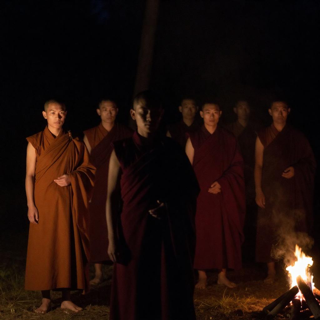 Photograph of six robed monks in a dark forest at night. One monk stands illuminated on the left, others in shadow. One monk is in the foreground, five in the background. A small fire burns on the right.