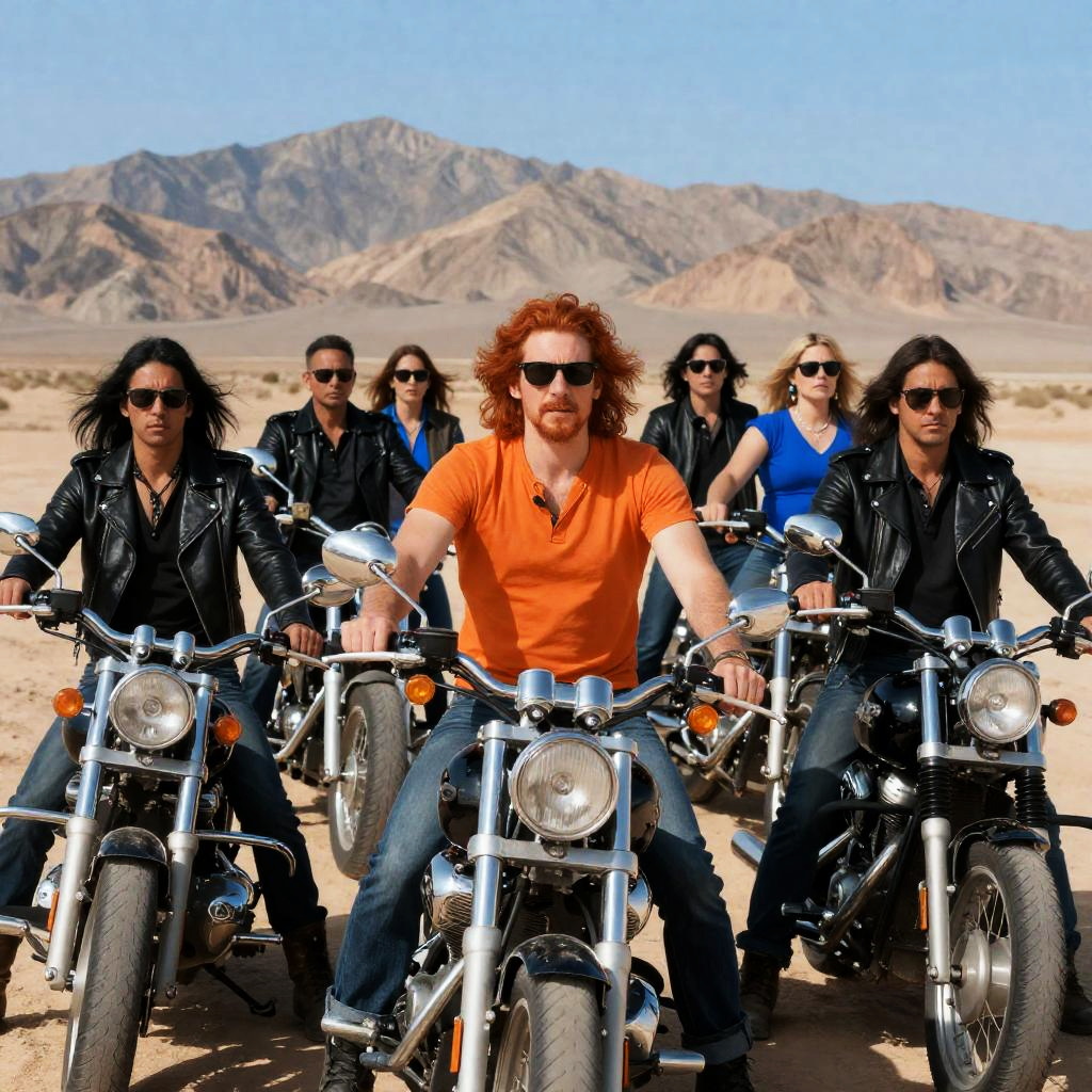 Photograph of six people with long hair, wearing sunglasses and leather, standing in front of several motorcycles in a desert with mountains in the background. Red-haired man in orange shirt center, others in black and blue tops. Bright daylight, clear blue sky. Motorcycles with chrome details, round headlamps. Group arranged in semi-circle, hands on handles. Desert landscape with sandy terrain and rocky hills. Intense expressions on faces.