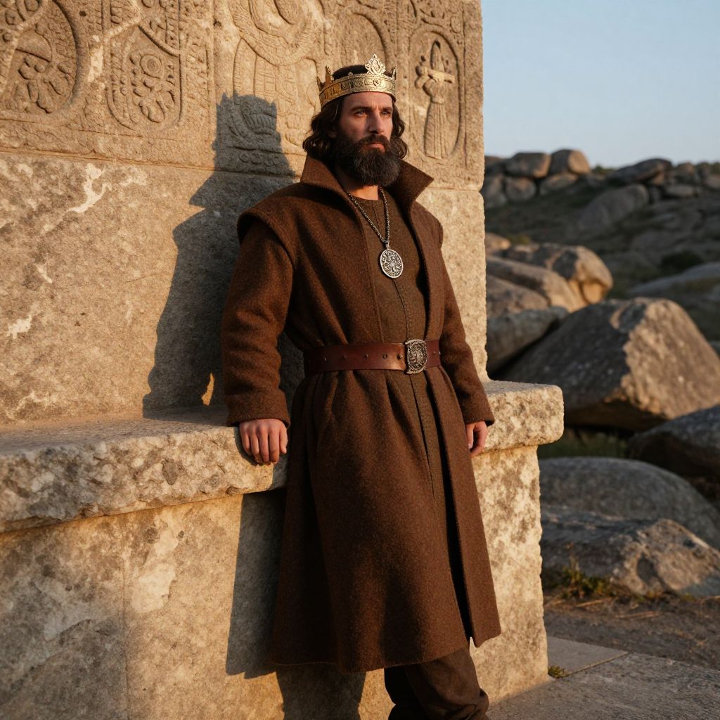 A dignified man with a full beard and a golden crown rests on a stone pedestal, standing in front of a weathered stone wall adorned with ancient carvings. He wears a brown woolen coat with a high collar, a sturdy leather belt, and a silver necklace with an intricate pendant hanging from it. His expression is calm and wise, with a quiet intensity in his eyes. The setting is a rocky, sun-dappled landscape at sunrise, casting long shadows and highlighting the textures of the stone and his clothing. The atmosphere feels timeless and mystical, blending history with a sense of quiet authority.