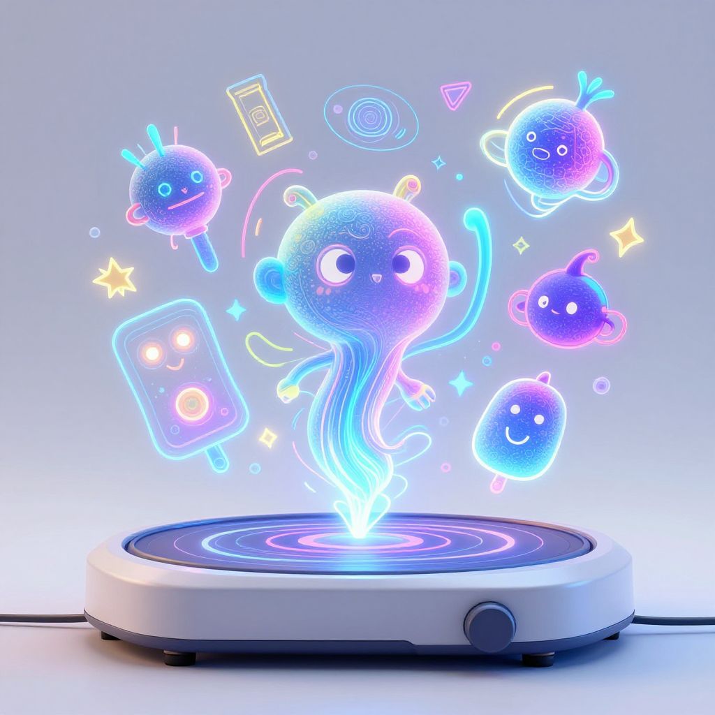 Futuristic doodle generator machine producing whimsical sketches into the air, holographic doodles forming delightful creatures and objects, neon colors and smooth flowing lines, surreal digital art style with a sense of creativity and innovation