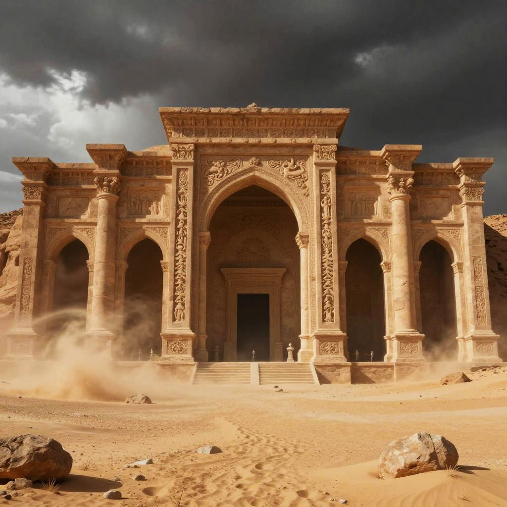 Tartarian architecture, surreal and monumental structures with huge arches, columns, and carved stone reliefs, set in a vast desert with swirling sandstorms, dark stormy skies adding drama and mystique, highly detailed fantasy art with a timeless feel