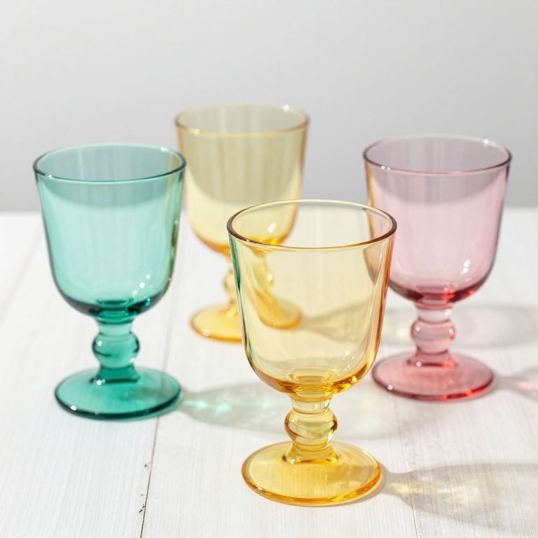 Beautiful colored drinking glasses in teal, yellow and pink on a table