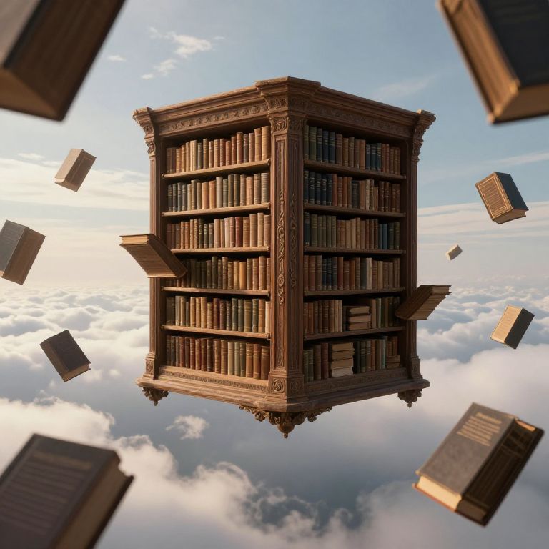 Suspended above a sea of ethereal clouds, an ancient library of floating books invites contemplation, its timeless wisdom whispering secrets of knowledge and wonder amidst the serene stillness of the heavens.
