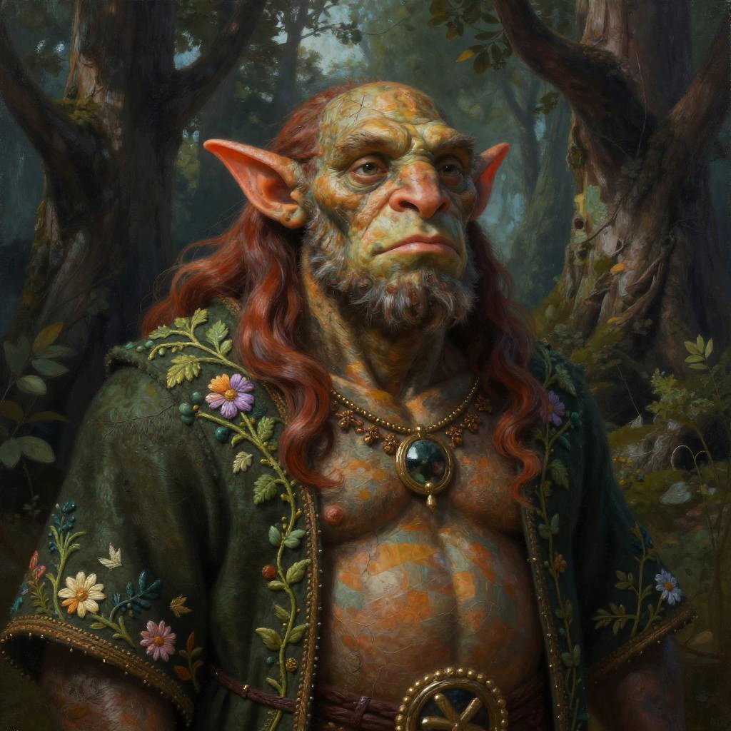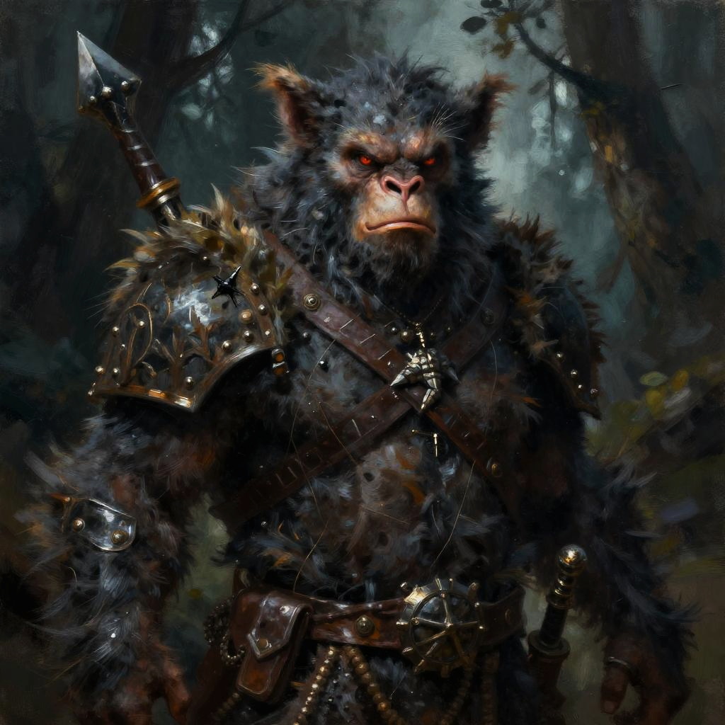 Realistic photo.Character portrait of a bugbear ranger with a fierce glare and woodland gear, in a dark fantasy setting, speedpaint style with impressionist oil art technique. Gritty brushstrokes, mournful mood, inspired by the styles of Symbaroum, Martin Grip, and Richard Anderson. realistic photo