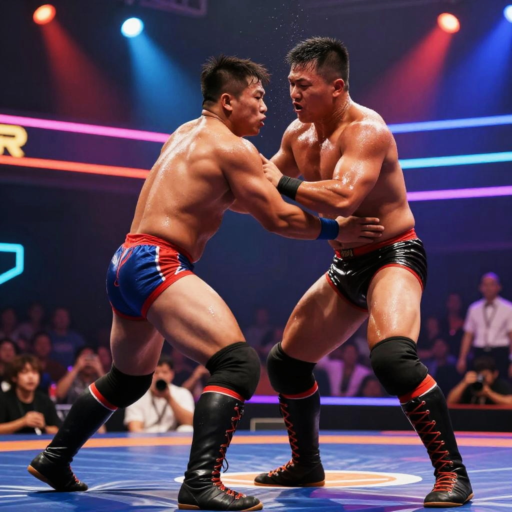 Two muscular Asian male athletes compete intensely in a thong wrestling match inside a vibrant neon-lit arena. Both wrestlers wear wrestling boots and minimal athletic wear, with sweat glistening on their bodies under dynamic colored spotlights. The high-energy scene captures the physical struggle and dramatic expressions of the competitors, surrounded by an engaged audience.
