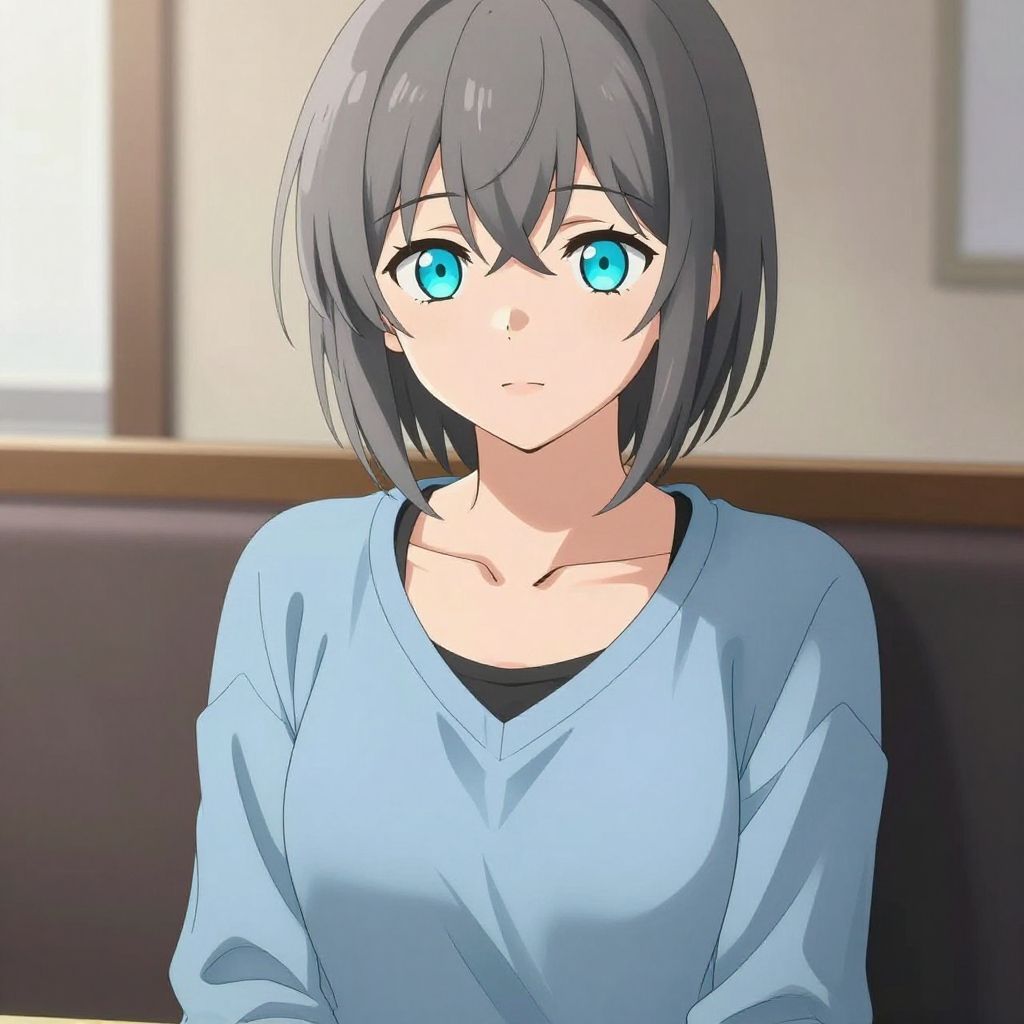 Digital illustration of an anime girl with short grey hair and aqua blue eyes. She wears a light blue long-sleeve V-neck top over a black undershirt. The character displays a calm expression and is seated indoors with soft natural lighting highlighting her collarbone and facial features.