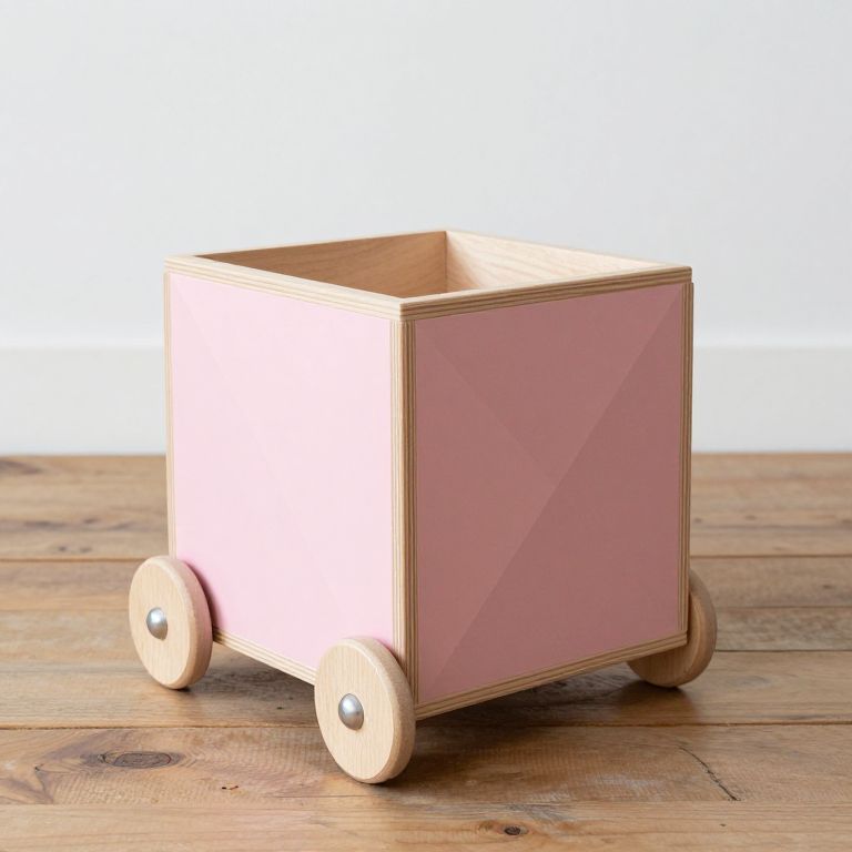 Handcrafted wooden toy box featuring a geometric design with pastel pink sides, natural wood accents, and two wheels, positioned upright on a rustic wooden floor against a plain white wall.