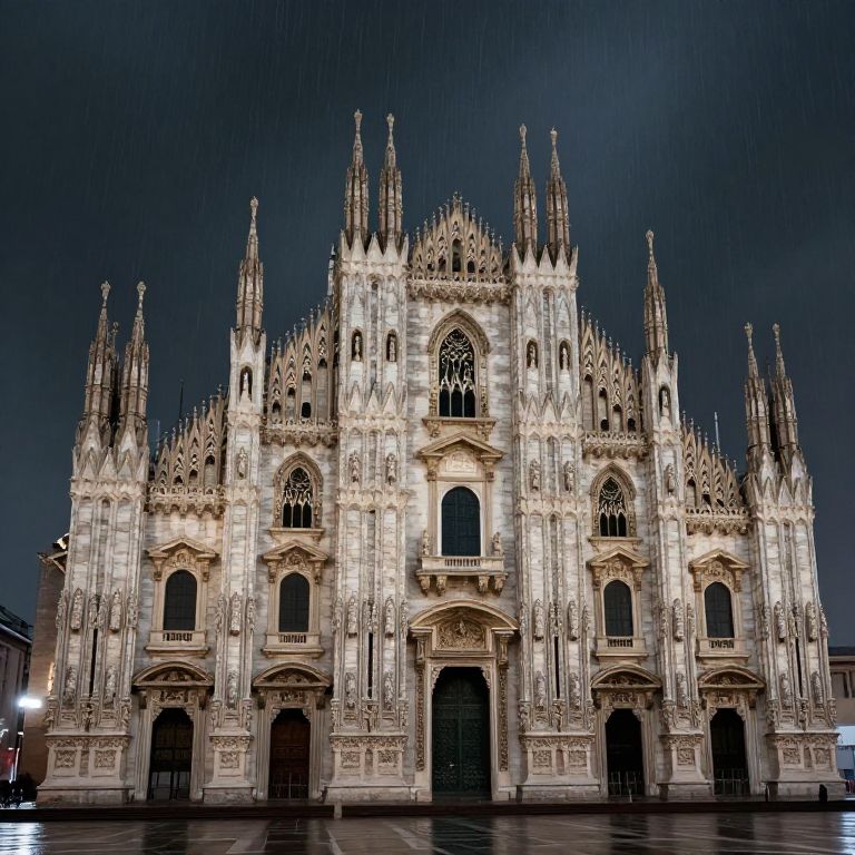 A hyperrealistic, volumetric-lit cathedral with intricate Gothic architecture, sharp details, and reflective surfaces, set against a dark, rainy backdrop with subtle particle effects.