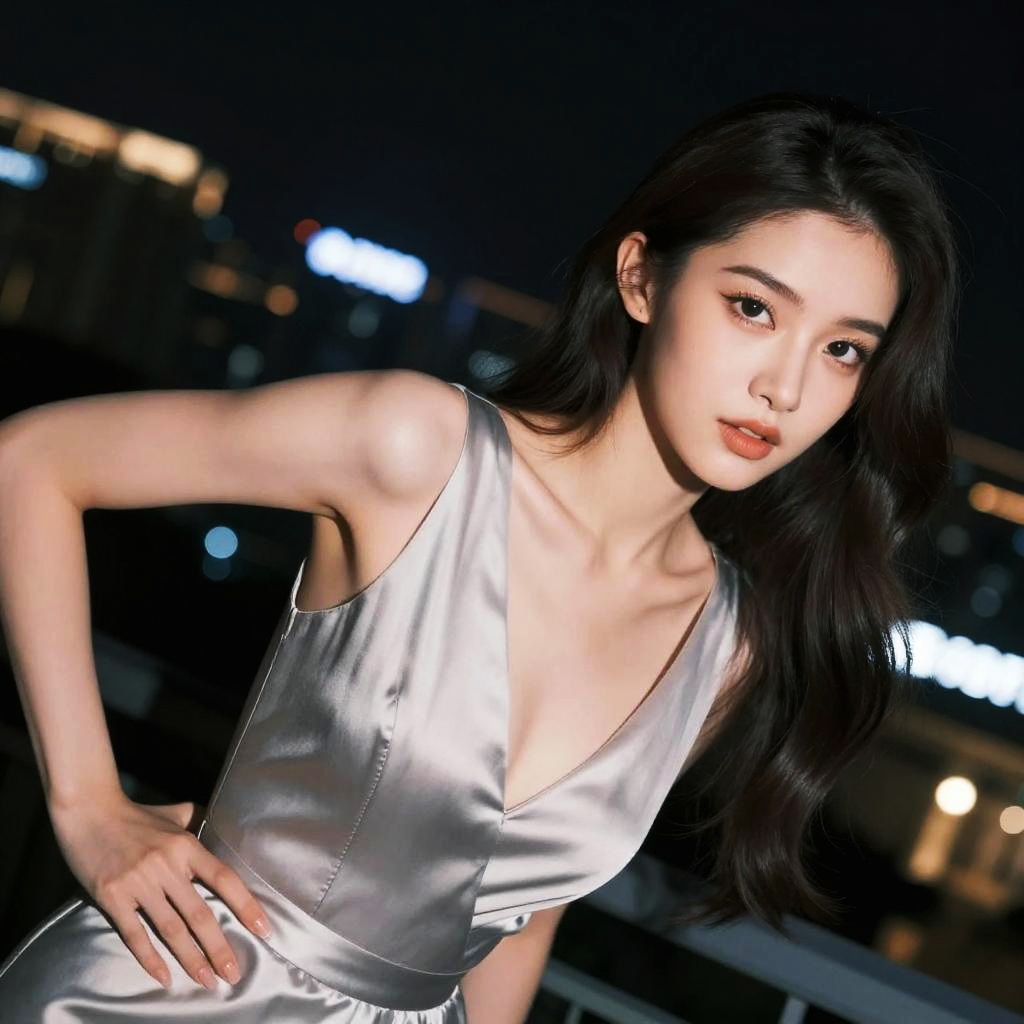 Portrait of an Asian woman with short dreadlocks hairstyle wearing an elegant, strapless pink satin dress. She is posing with one hand raised against a blurred futuristic cityscape at night, featuring soft cinematic lighting and sharp focus on finely detailed skin and facial features.
