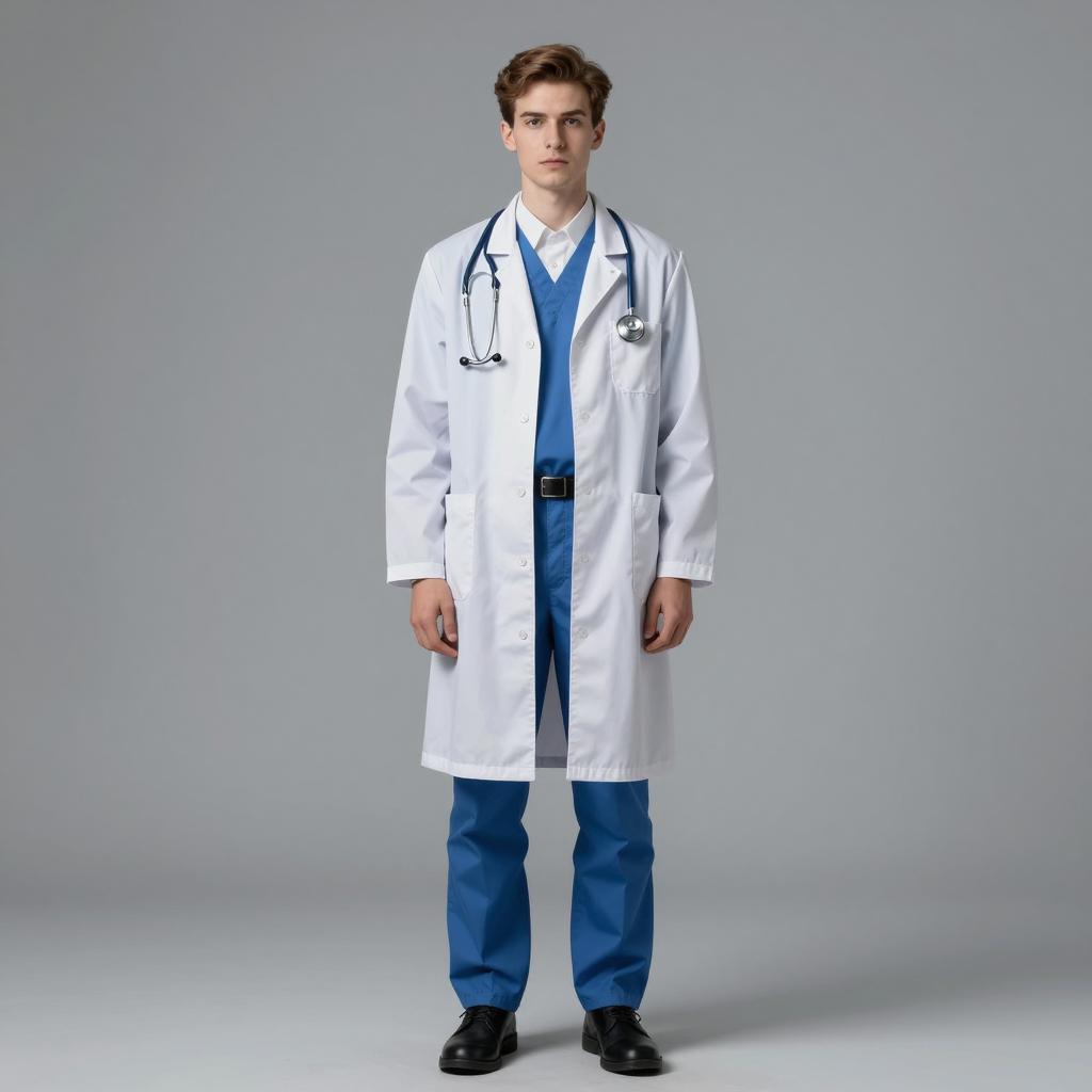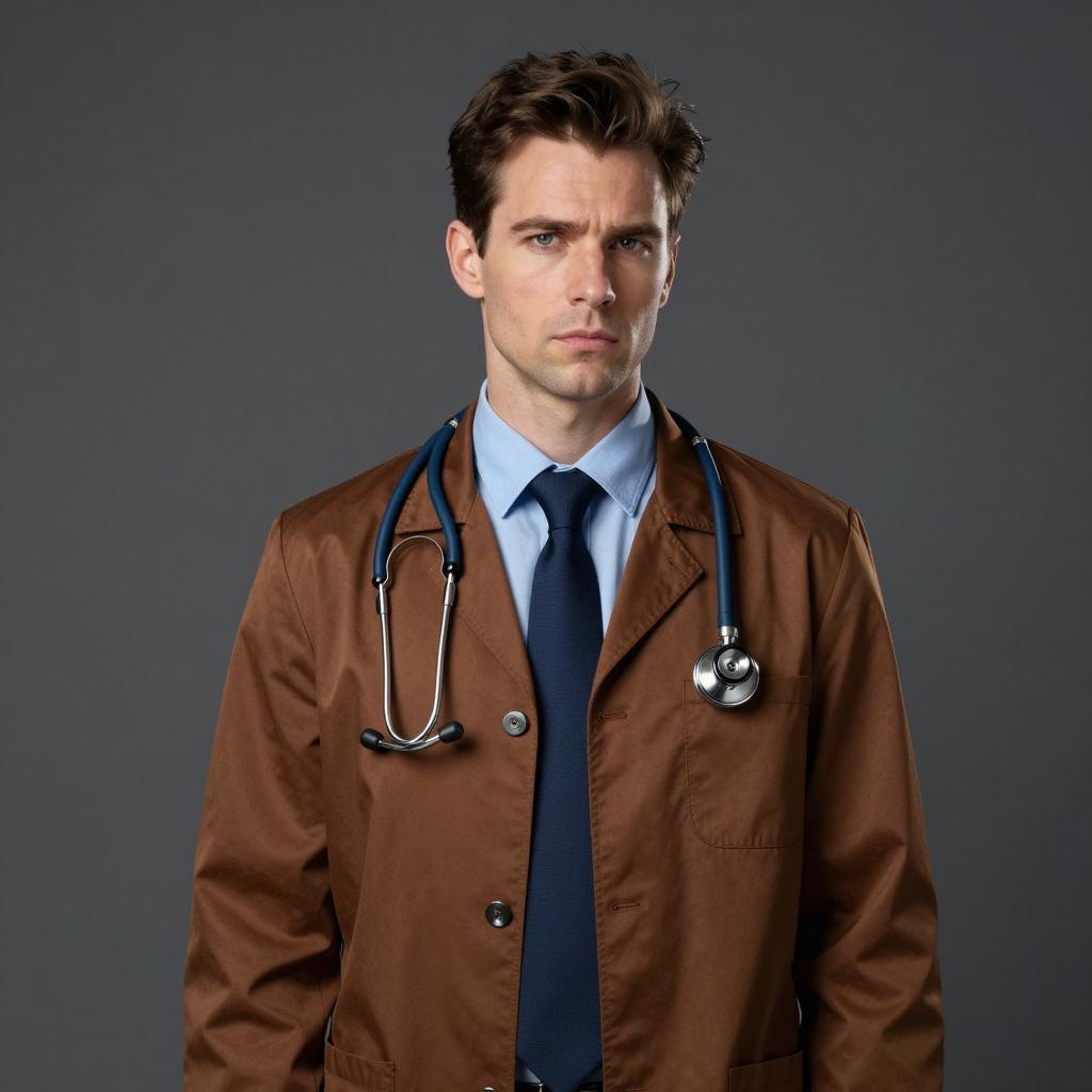 Doctor scrubs costume, photograph of a young male doctor, wearing teal medical scrubs, black rectangular glasses, short brown hair, clean-shaven, stethoscope around neck, white ID badge on chest, light gray background, neutral expression, soft lighting, frontal view, realistic style, clinical setting, professional attire, slight shadow on left side