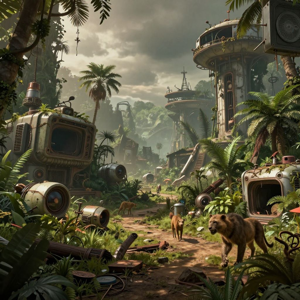 Stonepunk scene depicting a tribal village powered by stone and ancient machines, stone-built robots with wooden and metal components, glowing blue crystals as energy sources, wild prehistoric fauna roaming around, earthy tones and dramatic lighting, highly detailed environment.