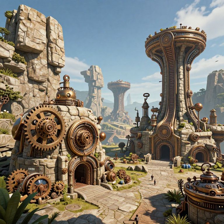This is a digital fantasy artwork depicting a steampunk-style village. The scene features towering, mechanical structures with glowing blue crystals and intricate gears, surrounded by small, humanoid figures in medieval attire. The village path is paved with stones, flanked by grass and rocks. The sky is overcast, with dark clouds. In the background, there are arched buildings and distant, triangular towers. The mechanical structures have a mix of rusty orange and metallic blue, with glowing blue eyes and crystals. Small animals and plants are scattered throughout, adding to the lush, yet industrial, atmosphere.