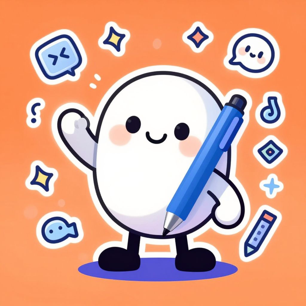 Cute Doodle AI character holding a digital pen, surrounded by floating doodle icons and geometric shapes, playful and imaginative style, rich color palette with smooth textures, modern illustration blending technology and art