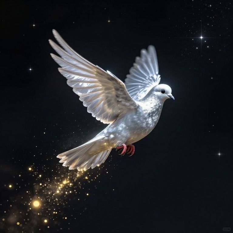A luminous dove, its feathers shimmering like molten silver, soars through a cosmic expanse, trailing a cascade of golden stardust against a dark, starlit backdrop.