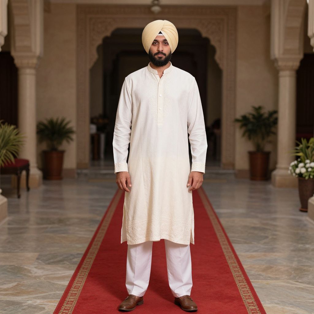 Forplay Costume India, man in a turban standing on a red carpet