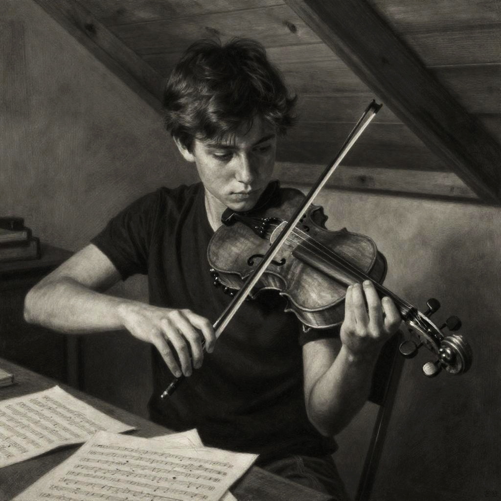 Charcoal painting by Emanuele Dascanio depicting a young blacksmith forging a sword, with sparks flying, glowing hot metal, muscular arms straining, in a rustic forge with smoke and embers, created with robust textures and vivid chiaroscuro