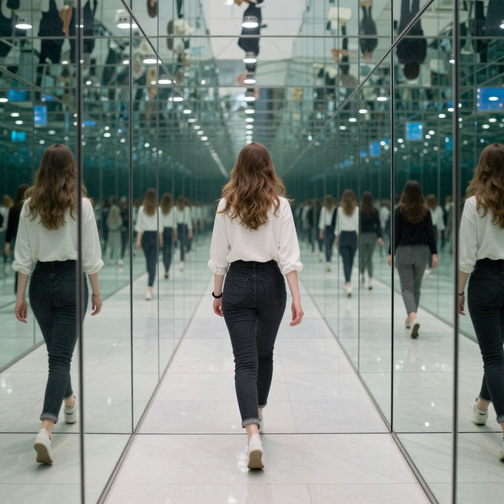 Woman walking down a mirrored corridor, her reflection endlessly duplicated by walls of glass, creating an illusion of infinite repetition and introspection.