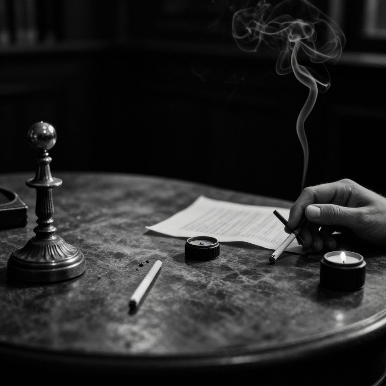 A black-and-white photograph depicts a dark, textured wooden table with a chess piece, a lit candle, a closed inkwell, a pen, and a sheet of paper with writing. A hand, partially visible, is holding a cigarette, with smoke curling upwards. The background is blurred, emphasizing the table and objects in the foreground. The image has a moody, dramatic atmosphere, with high contrast highlighting the textures and objects on the table.