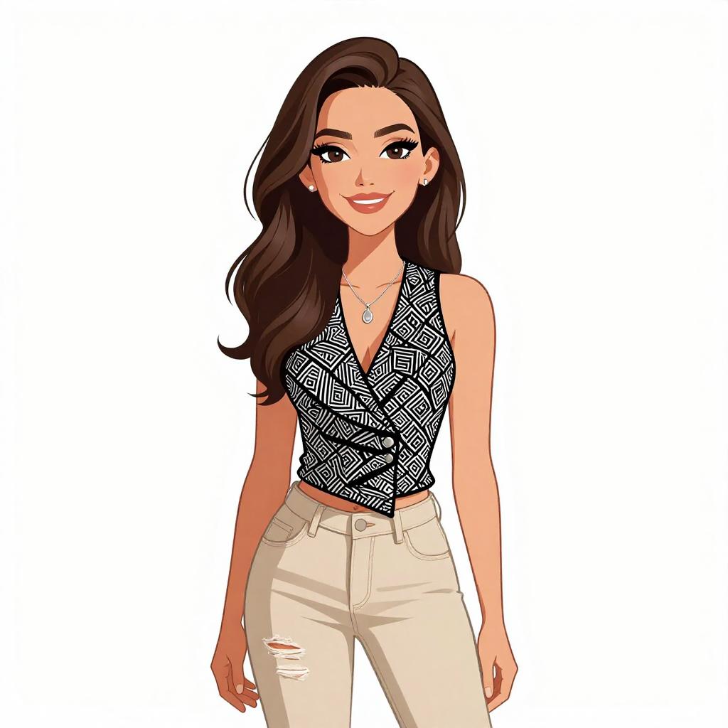 Woman with pretty face and pretty hair. smiling Woman, casual, black and white geometric print waterfall vest, sleeveless, draped front, light beige skinny jeans with distressed details, silver pendant necklace. --sref 1467