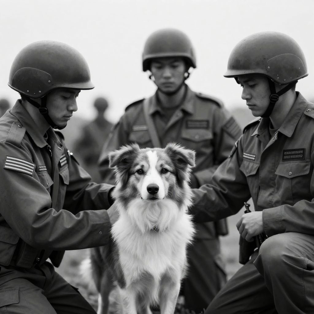 Black and white photograph of three soldiers in helmets, one on the left gently petting a medium-sized, fluffy dog with a white and brown coat, standing in the center. Second soldier on the right looks down at dog. Background shows blurred soldiers in helmets. Dog's ears are perked, soldiers' expressions are calm.