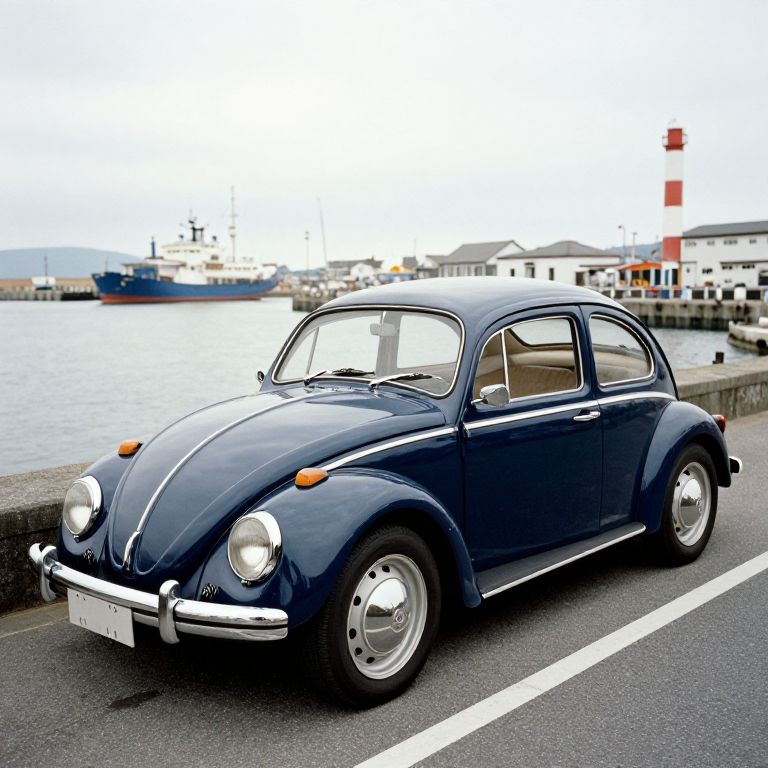 B-Side vw beetle parked next to the harbor, in the style of chen zhen, japanese photography, xu beihong, navy, nostalgic scenes, photo taken with provia, marguerite blasingame,