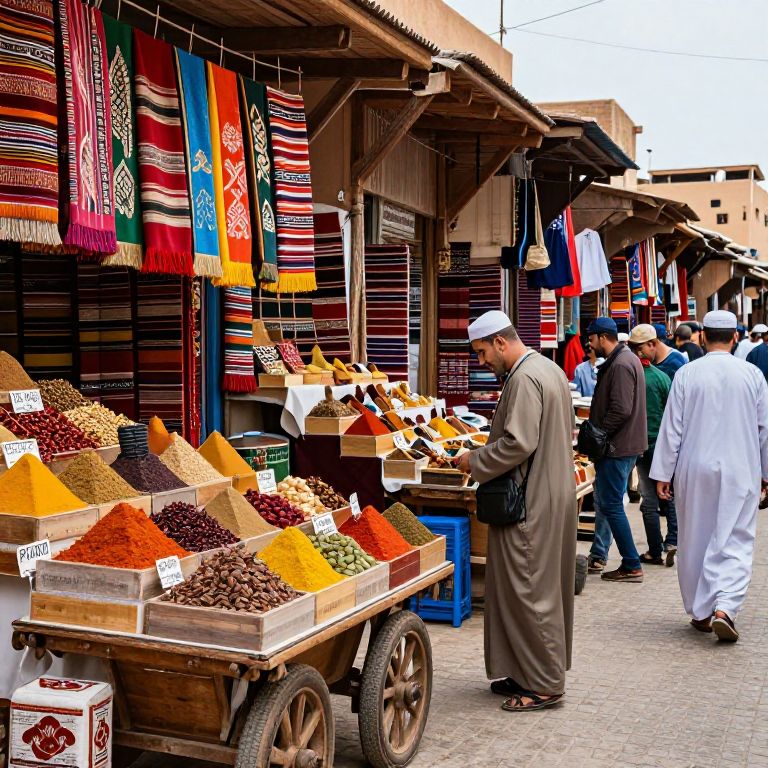 Vibrant spices spill across wooden stalls beneath cascading orange canopies, as a woman in a crimson coat pauses to admire the bustling market scene, her gaze following the path of three figures walking away into the fading sunlight.