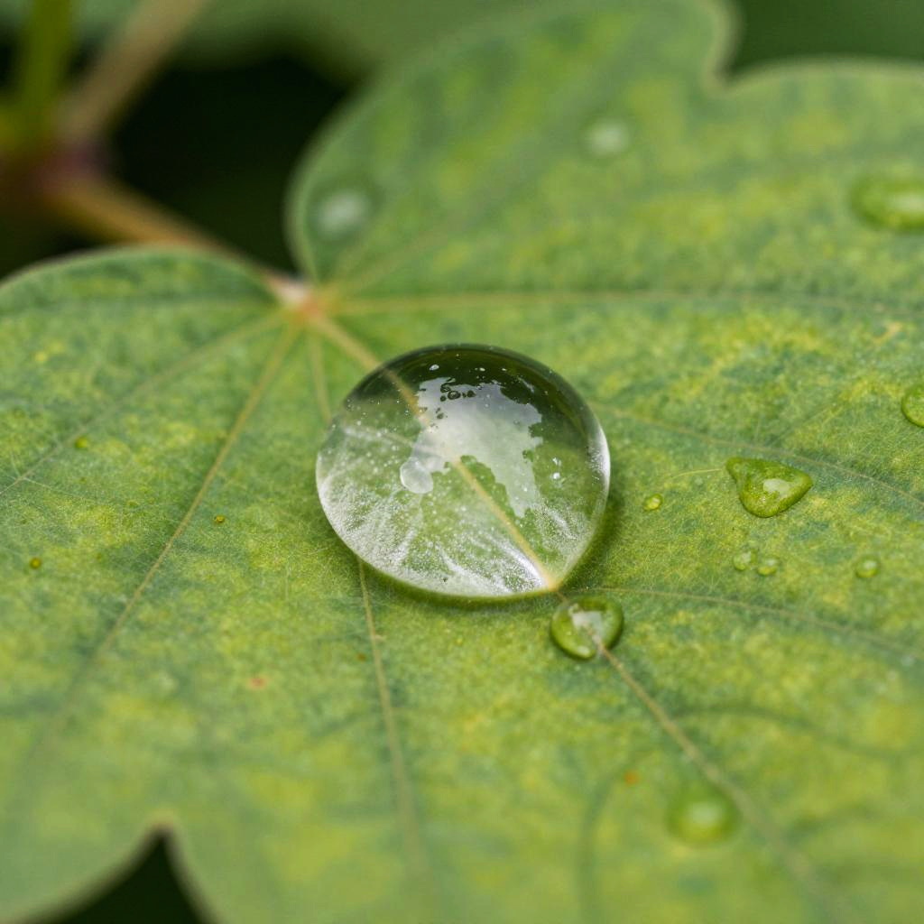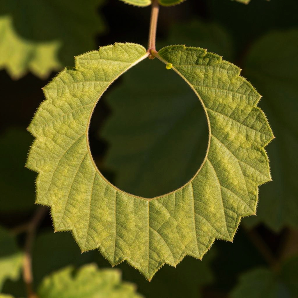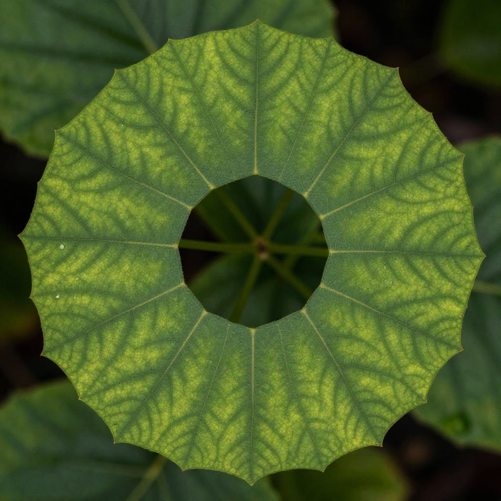 Ring shaped leaf with intricate veins forming a perfect circular loop, vibrant green hues with subtle dewdrops reflecting soft morning light, set against a blurred natural forest background, highly detailed botanical illustration style.