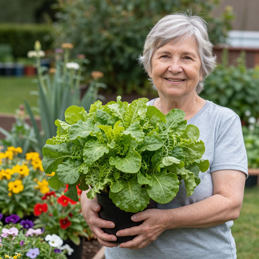 A photograph of an elderly woman with short, white-gray hair, smiling while holding a black pot filled with vibrant green lettuce leaves. She wears a light gray, short-sleeved t-shirt. The background features a colorful garden with yellow, red, purple, and white flowers, and blurred greenery. She stands on a grassy area, with a wooden fence and indistinct building in the distance. The image is brightly lit, emphasizing the freshness of the lettuce and the cheerful garden.