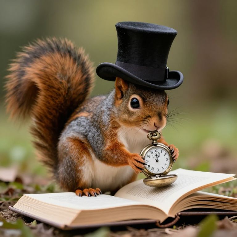 In a world where whimsy meets wisdom, a scholarly squirrel dons a top hat adorned with a pocket watch, embodying the timeless pursuit of knowledge amidst the gentle rustle of turning pages and the quiet hum of curiosity.