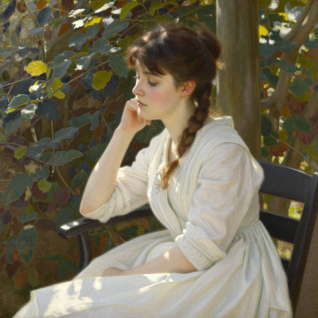 Digital painting of a young woman with braided brown hair, wearing a white, lace-trimmed dress, sitting in a sunlit garden, lost