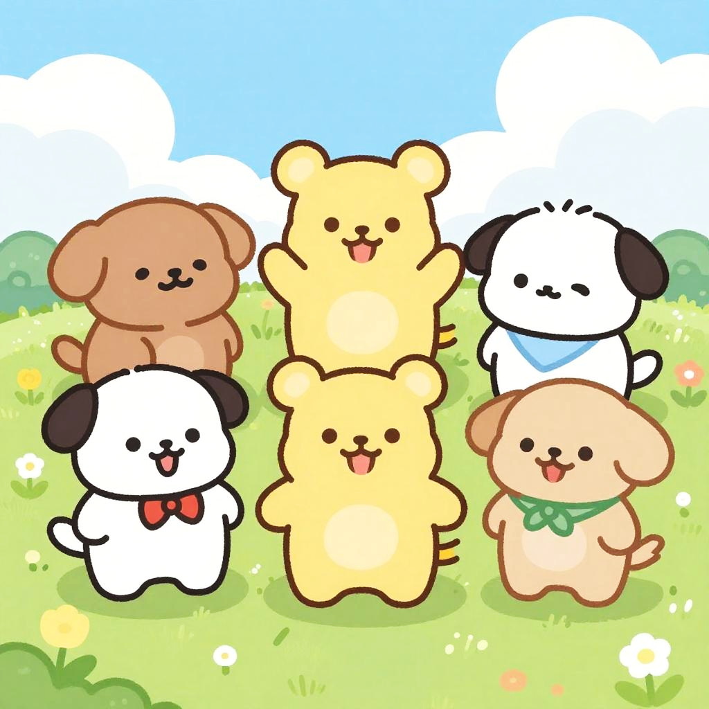 Cute kodomo art style scene with friendly animals and children in vibrant colors, dreamy and fun atmosphere, childlike patterns and textures, simplified forms with a cheerful vibe